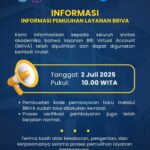 Kami informasikan bahwa layanan BRI Virtual Account (BRIVA) telah kembali normal dan dapat digunakan kembali mulai tanggal 2 Juli 2025 pukul 10.00 WITA.
