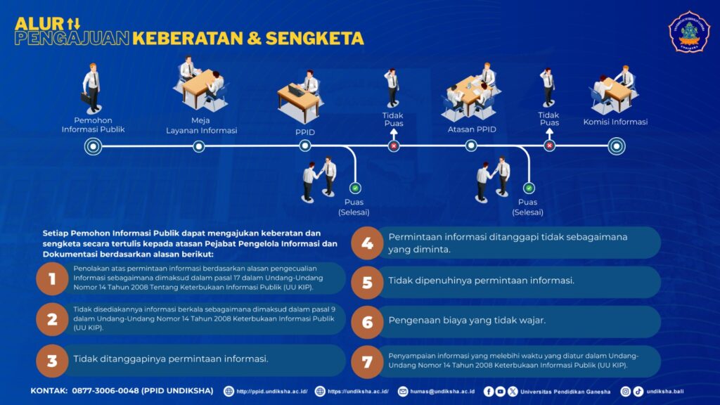 - Pemohon dapat mengajukan keberatan informasi dengan mengisi formulir keberatan secara online di website PPID Undiksha atau di Kantor PPID yang ditujukan kepada atasan PPID Undiksha.